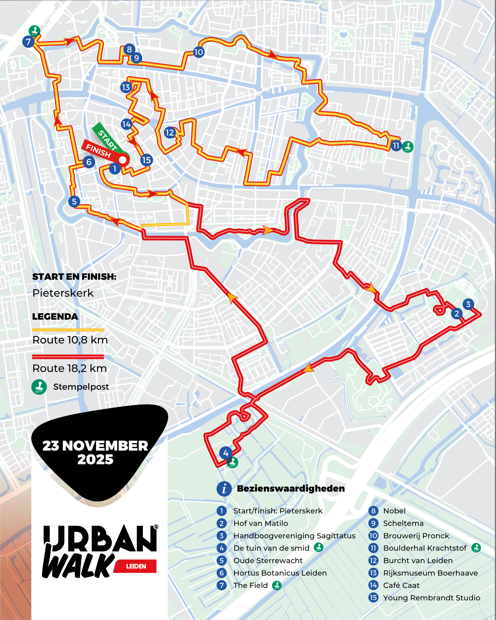 Maak je klaar om bijzondere en unieke locaties te bezoeken tijdens de Urban Walk Leiden. De korte route van ongeveer 10-12 kilometer en de lange route van ongeveer 18-20 kilometer worden ieder jaar opnieuw samengesteld om nieuwe highlights en locaties toe te voegen.